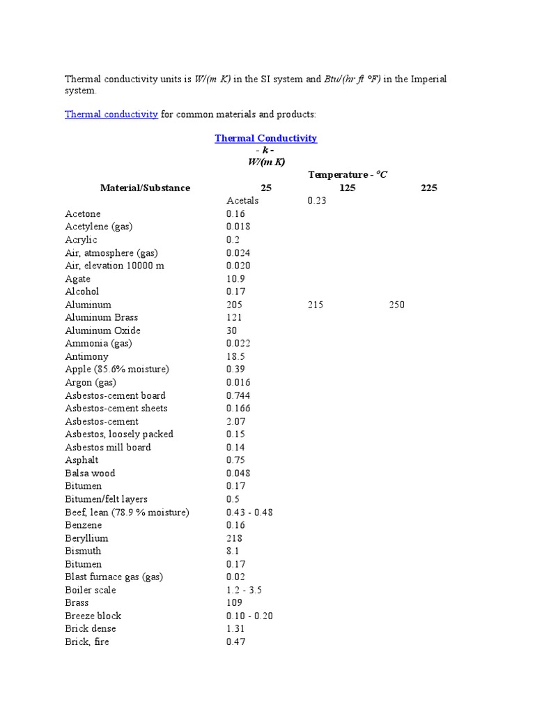 Thermal conduction is the transfer of heat from one part of a body to another with which it is in contact. K thermal conductivity w mk btu hr ft f dt t 1 t 2 temperature difference o c o f s wall thickness m ft conductive heat transfer calculator. Thermal properties astm test method units values maximum recommended continuous service temperature f 170 190 softening temperature f 210 220 melting temperature f 300 315 deflection temperature 264 psi 66 psi d 648 f 203 207 coefficient of thermal expansion 30 to 30 c d 696 in in f x 10 5 3 0 thermal conductivity c 177 btu ft hr ft2 f 0 075. K thermal conductivity w mk btu hr ft f s wall thickness m ft a surface area m 2 ft 2 dt t 1 t 2 temperature difference o c o f.
